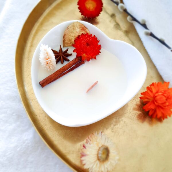 La bougie “Été Indien” remplie votre cœur de douceur pendant les soirées d’automne et d’hiver, elle ajoutera une touche de gaieté dans votre intérieur. Agrémentée d’une feuille d’eucalyptus, d’une immortelle orange, d’une étoile d’anis et soulignée par un bâton de cannelle, cueillies à la main dans nos provinces françaises.